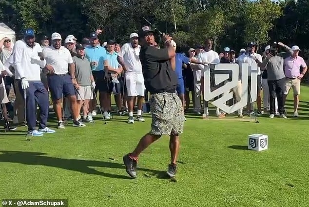 Video filmed from close range shows the artist preparing to hit while surrounded by onlookers at the tee box in the Bahamas.